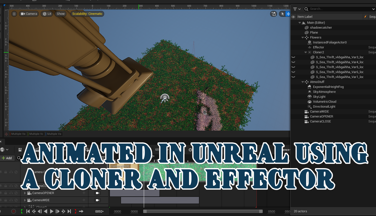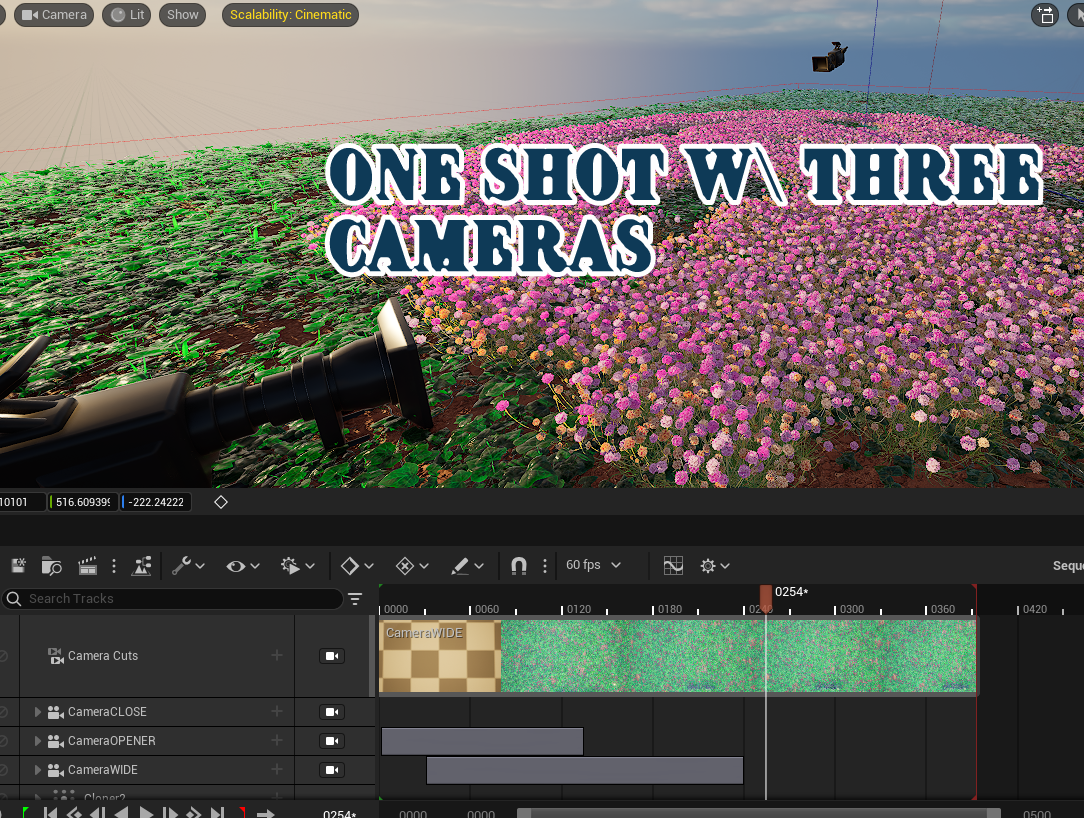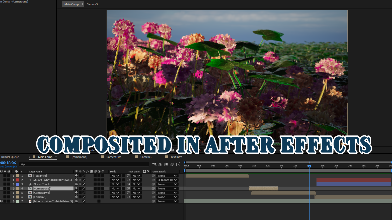 I used a cloner on mega-scanned flowers and an effector to make the flowers" bloom" by animating the effector path underneath the ground plane. There are two cameras in the scene and I took both and slowed them down using After Effects.